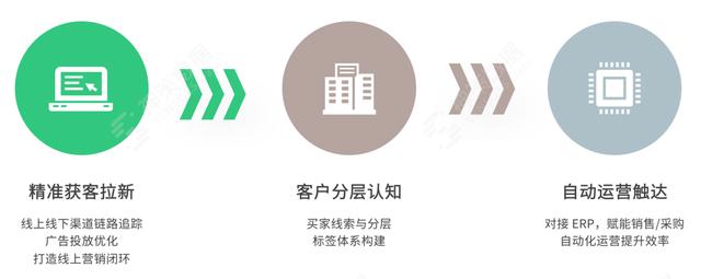 第三阶段的 B2B 线上业务已逐步渗透、逐步成熟,需要提升下沉市场或自营业务渗透,这一环节里,重点需要借助线上流量、营销体系自运转来提升转化。神策数据将线上营销闭环的打造总结为三个重要的步骤,包括精准获客拉新、客户分层认知、自动运营触达。如下图所示: